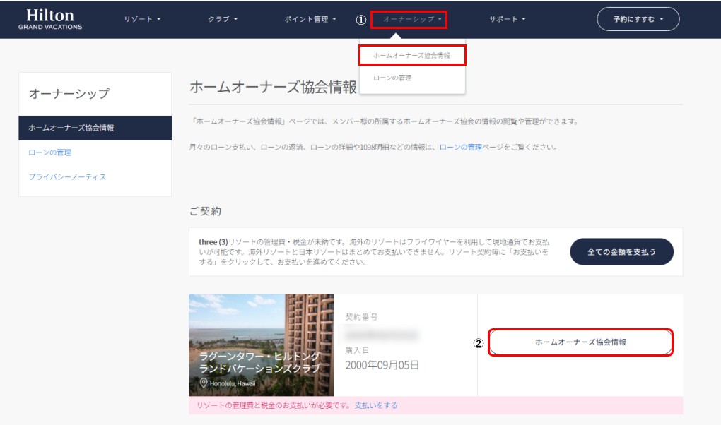 1. メンバーウェブサイトにログインし、メニューバーに表示される「オーナーシップ」(①)内の「ホームオーナーズ協会情報」をクリック(選択)します。