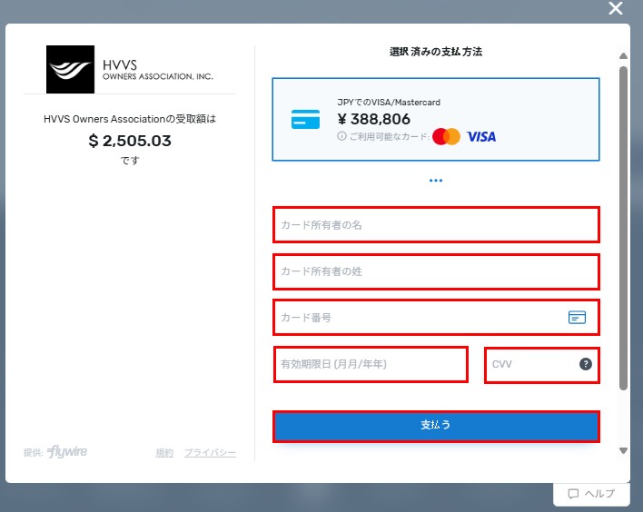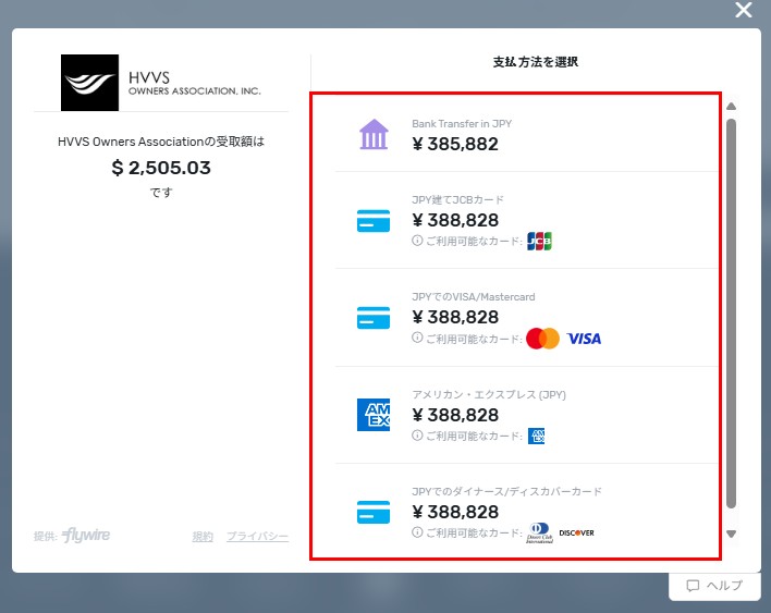 管理費のお支払いにはクレジットカード、Flywire (フライワイヤー)、ボーナスポイント(ポイントを所有している場合のみ)がご利用いただけます。