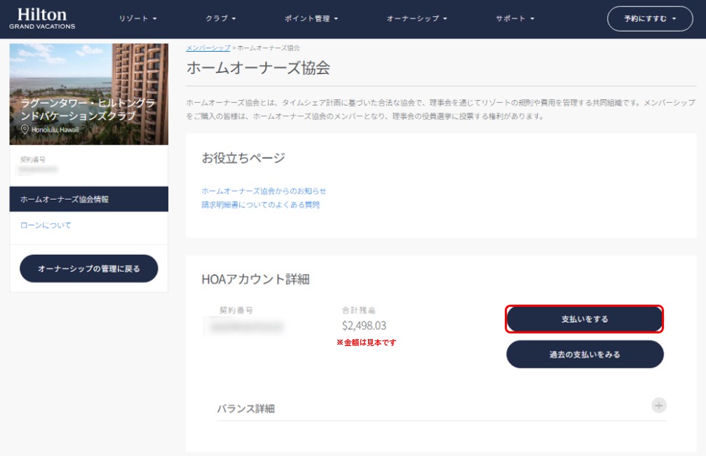 過去の支払い履歴は、「HOAアカウント詳細」項目内の「過去の支払いをみる」をクリックすると表示されます。なお、ボーナスポイントでのお支払い分は履歴に表記されないので、ご注意ください。