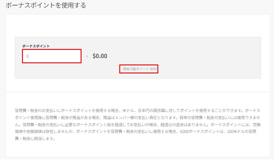 「ボーナスポイントを使用する」の入力欄が表示されます。ボーナスポイントを使用して管理費を支払う場合は、使用するポイント数を入力してください。