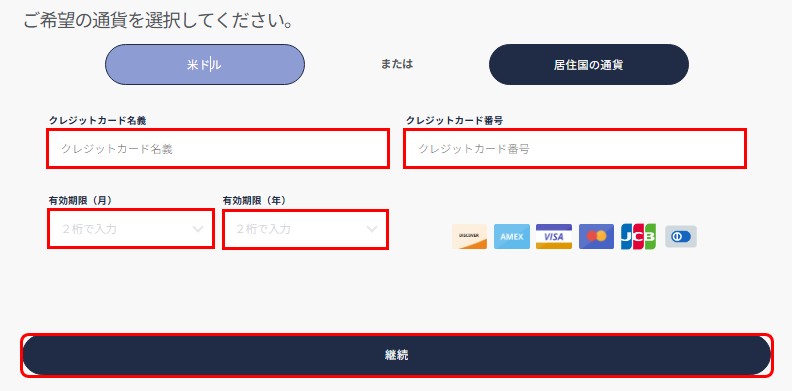 米ドルでの支払いをご希望の場合は、「米ドル」をクリック後、下のクレジットカード情報を全てご入力の上、「継続」をクリック。