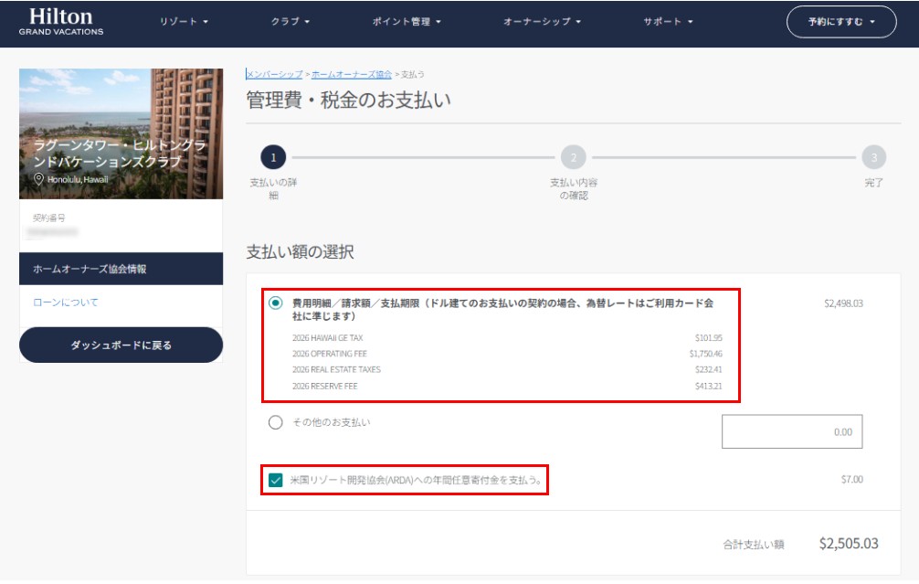 米国リゾート開発協会(ARDA)への任意の寄付金を支払う場合はチェックボックス(赤枠)をクリックしてください。