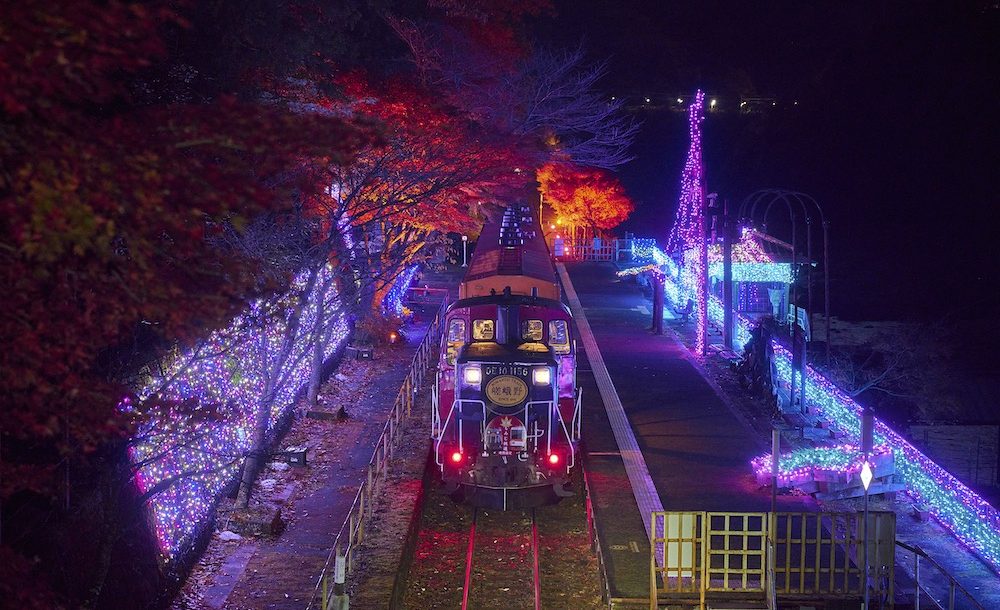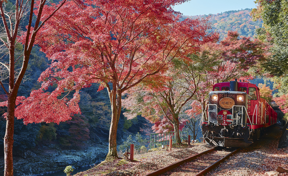 嵯峨野・嵐山を訪れる際の移動手段として選びたいのは、嵯峨野トロッコ列車。トロッコ嵯峨駅からトロッコ亀岡駅まで、全長7.3kmの道程を約25分間で結ぶ観光列車です。赤いレトロな列車が大自然の保津川渓谷を走る姿はとてもノスタルジック。車窓から眺められる自然と清々しい空気を思いっきり楽しんでください。また、12月下旬まではライトアップ&イルミネーションを実施。光り輝く列車が走る夜の風景はロマンチックなひとときを演出してくれます。