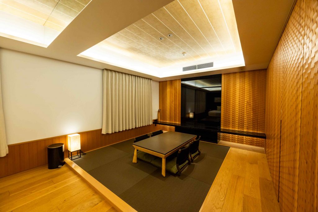 ベッドの向かいにある小上がりは、畳をモダンなデザインかつ落ち着いたカラーに変更。