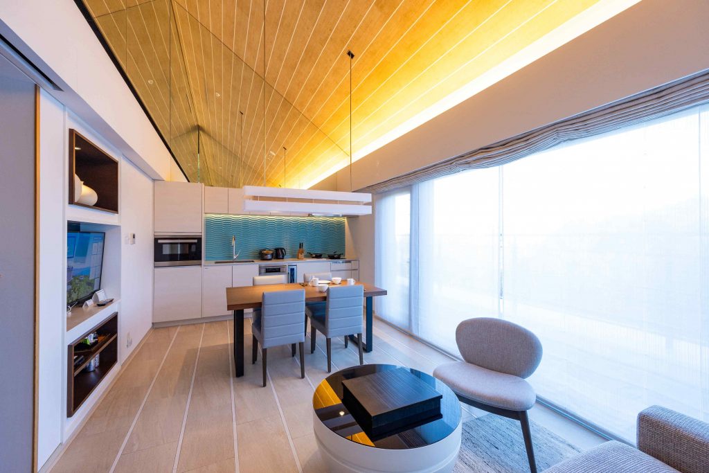 ザ・ベイフォレスト小田原の客室は2階建てのコテージタイプになっており、2階にある玄関から中に入ったところにリビングとダイニングが広がっています。