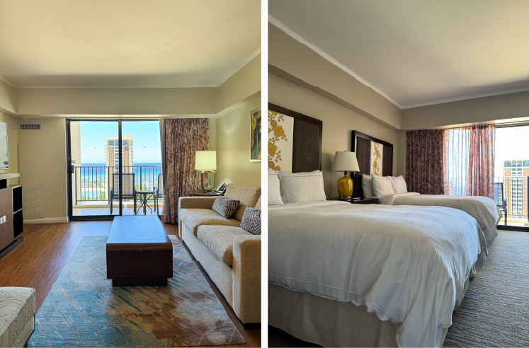 一人旅や二人旅にぴったりで、居心地の良さも文句なし。私が宿泊した1ベッドルームはオーシャンビューで、レインボータワー越しに見えるビーチやラグーンが素敵でした。
